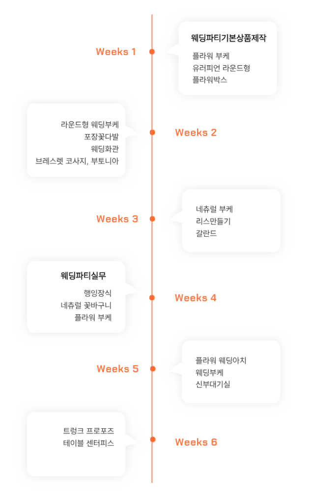 웨딩의 필수 요소인 다양한 형태의 부케, 코사지, 화관 제작법을 통해 고품격 웨딩 소품과 최신 트렌드를 반영한 상품 기획력을 함께 배양합니다.